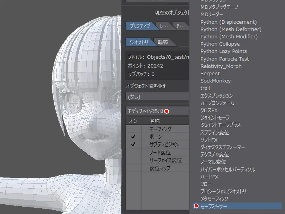 おおまかに流れを書きますと、まずはオブジェクトプロパティから「モーフミキサー」を追加します