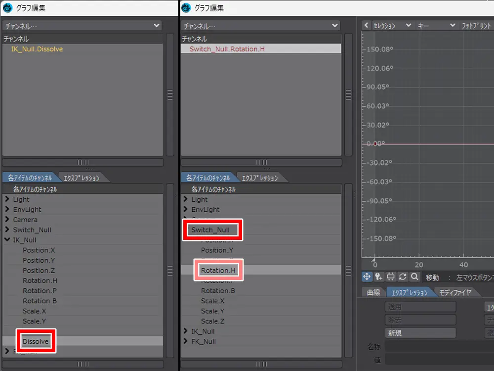 各アイテムのチャンネルタブから IK_Null を開いて、IK_Null.Dissolve を選択します
