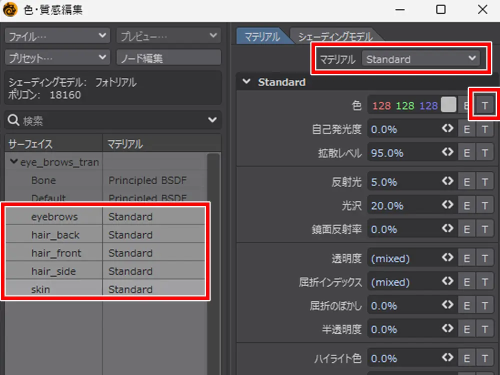 どれか一つサーフェイスを選んで、色項目の右端にある T をクリック