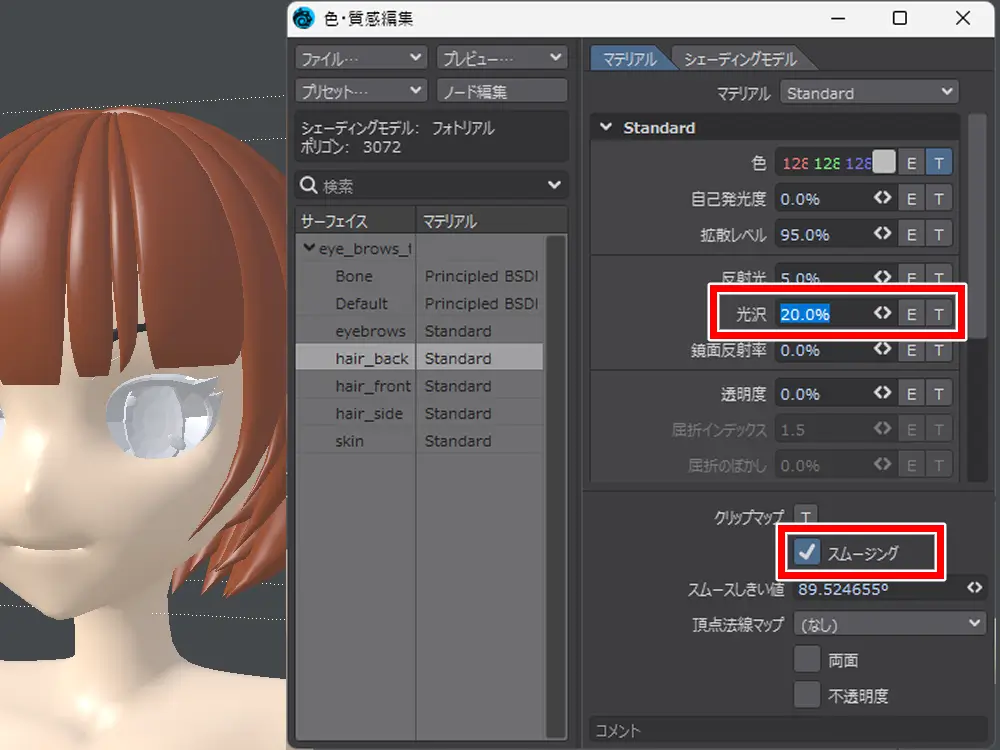 光沢を調整したり、スムージングを有効にしたりして見やすく変更します