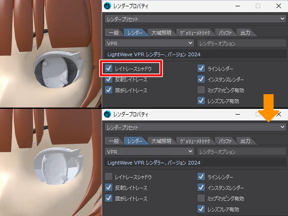 透過の状態は VPR かレンダリングで確認しますが、初期状態だと「レイトレースシャドウ」が有効になっています