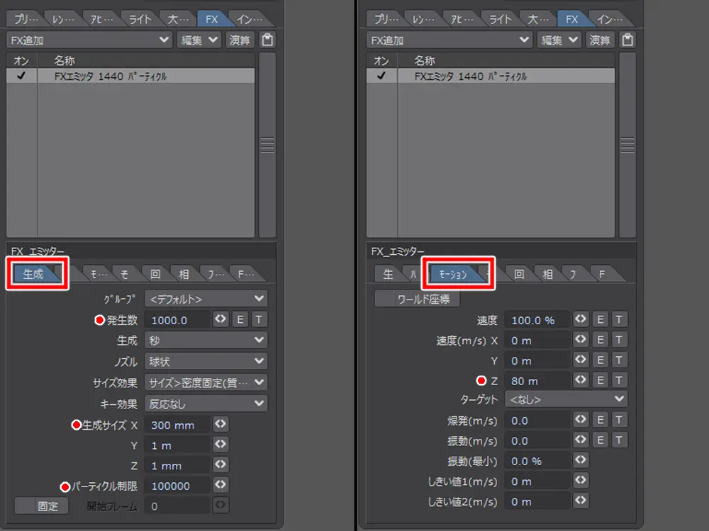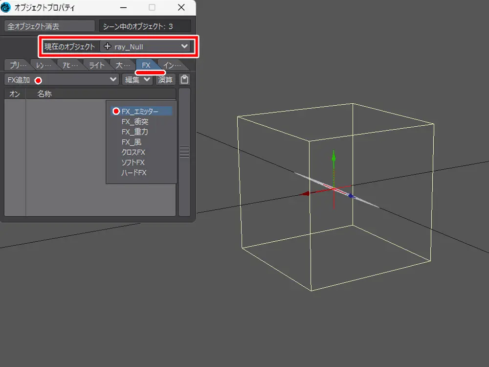 FX タブの FX 追加から「 FX エミッター」を追加して、パーティクルを放出するようにします