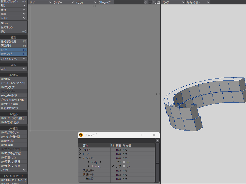 削除した右半身分の UV を、「頂点マップの鏡面コピー」を使って作ります