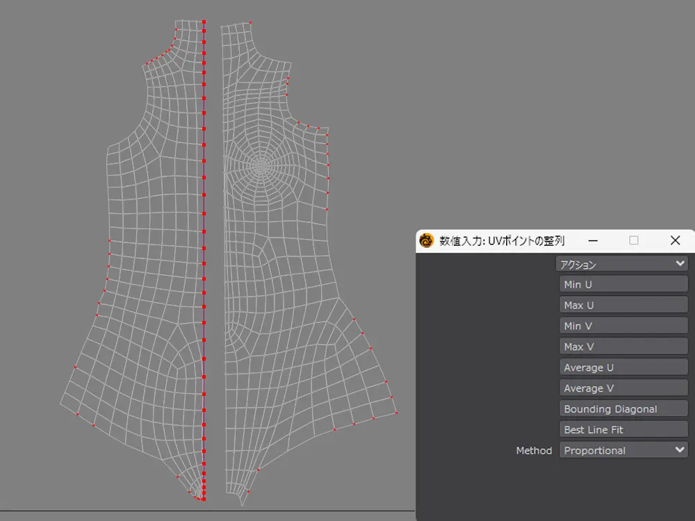後に反転コピーしますが中心線はまっすぐである必要があるので、「 UV ポイントの整列」を使ってポイントの位置を中心に整えます