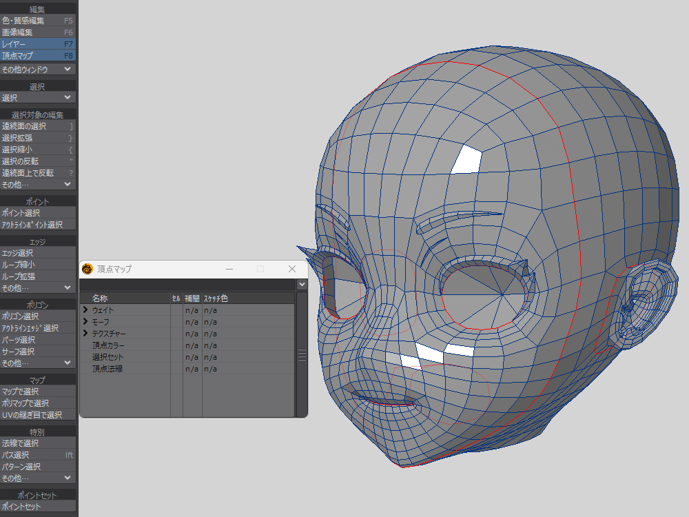 また、「マップ消去」を実行するときは、必ずテクスチャー選択( UV マップ選択)されているかどうかの確認が必要です