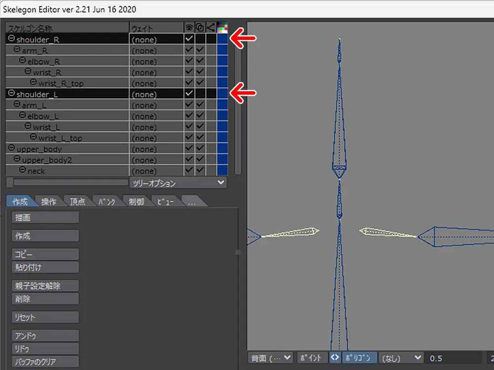 これで標準機能で組む場合と、Skelegon Editor で組む場合の二通りのやり方が分かりました