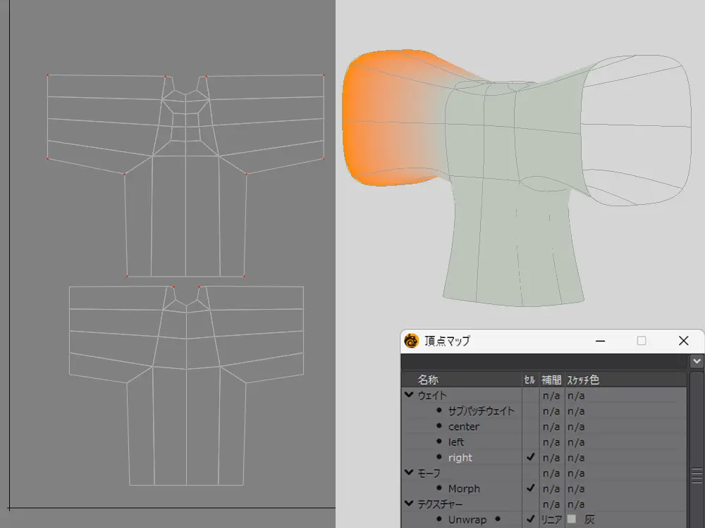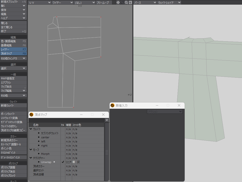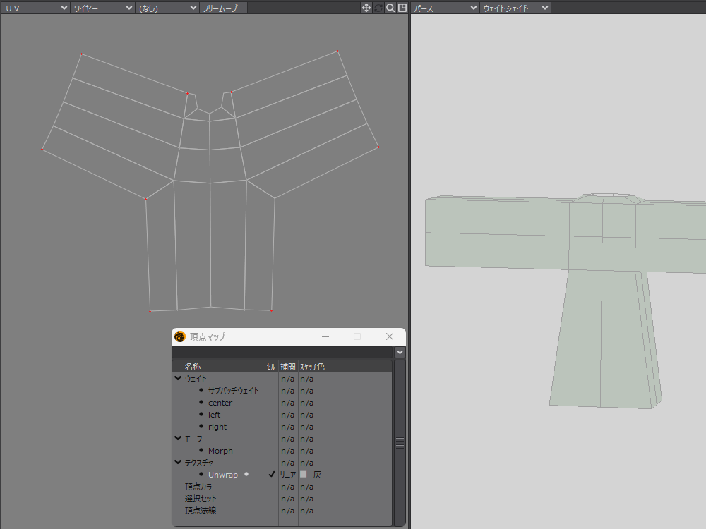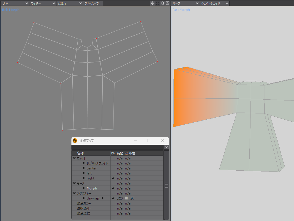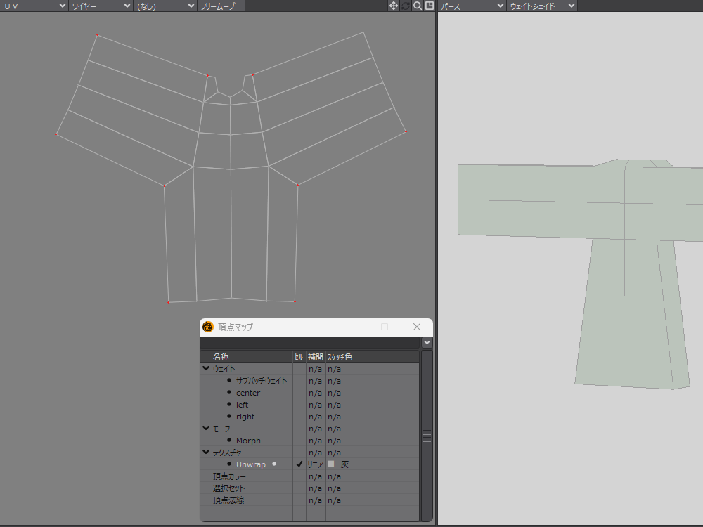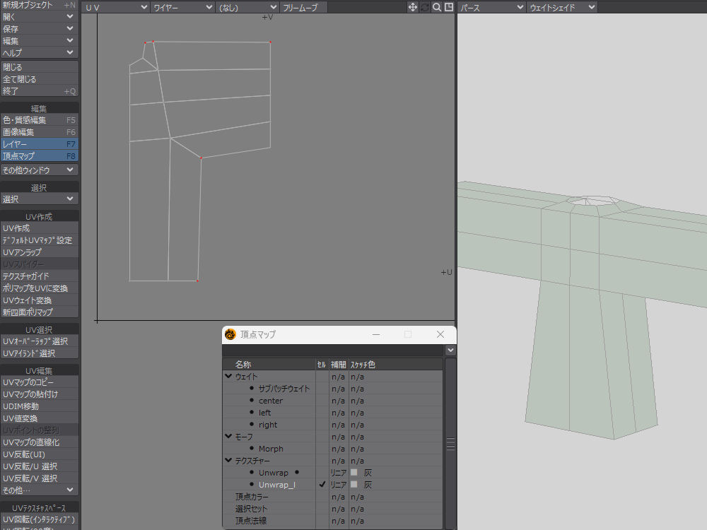 上の画像は失敗例ですが、モーフマップやウェイトマップを選択した状態で「マップ消去」を実行すると、UV マップ以外のものが消えちゃいます