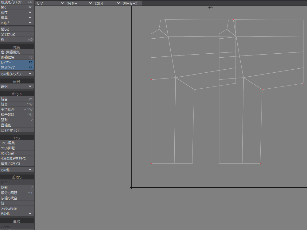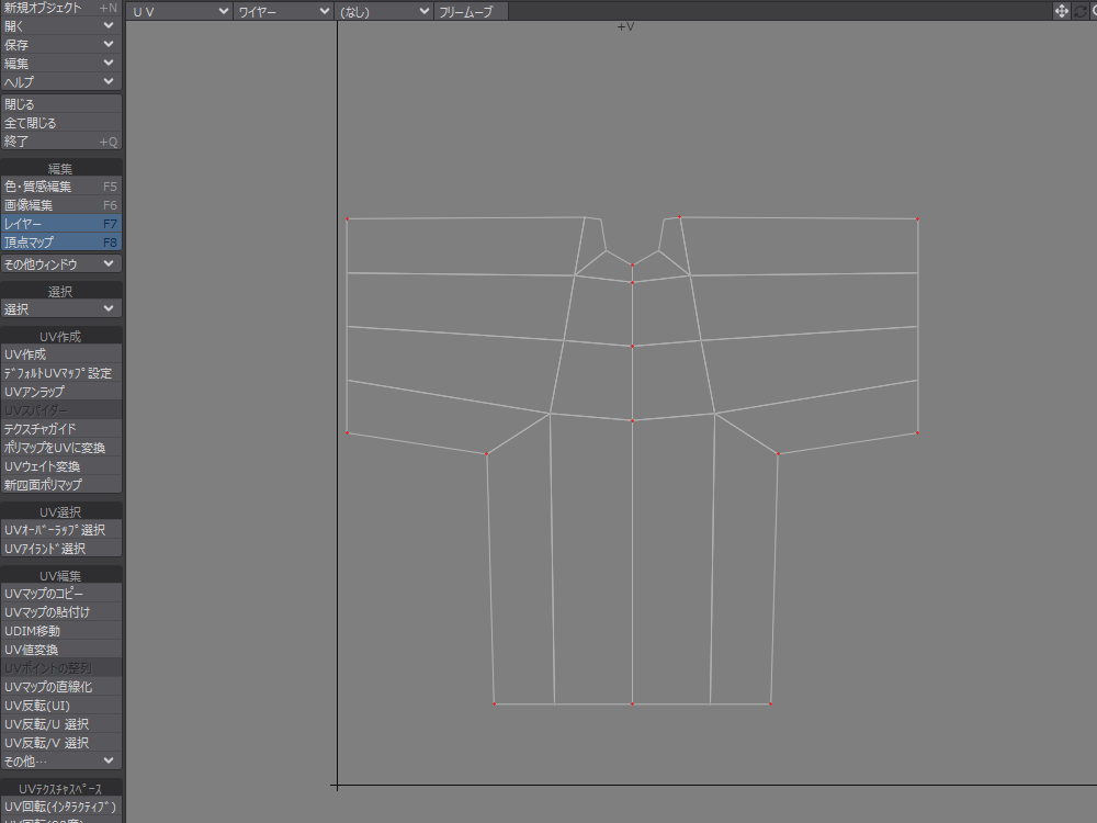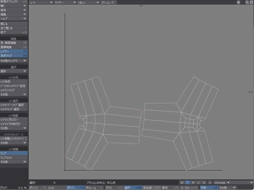 必ずポイント選択モードかつテクスチャー( UV マップ)が選択されていることを確認してから、「マップ消去」を実行します