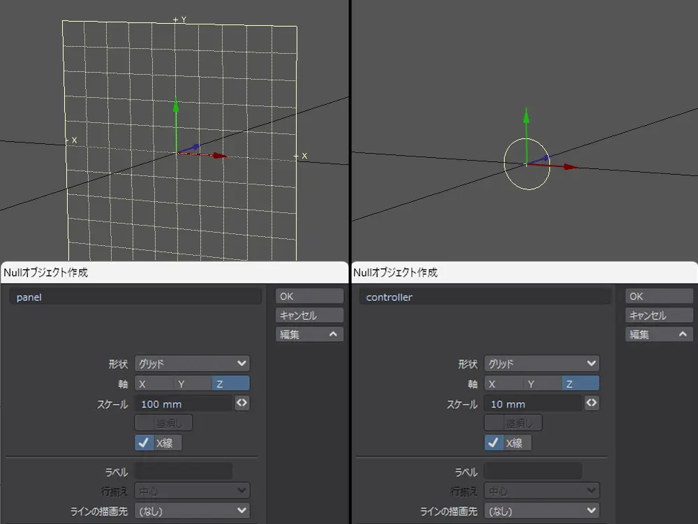 まずは操作用のパネルを作る必要があるので、Null というものを二つ用意します