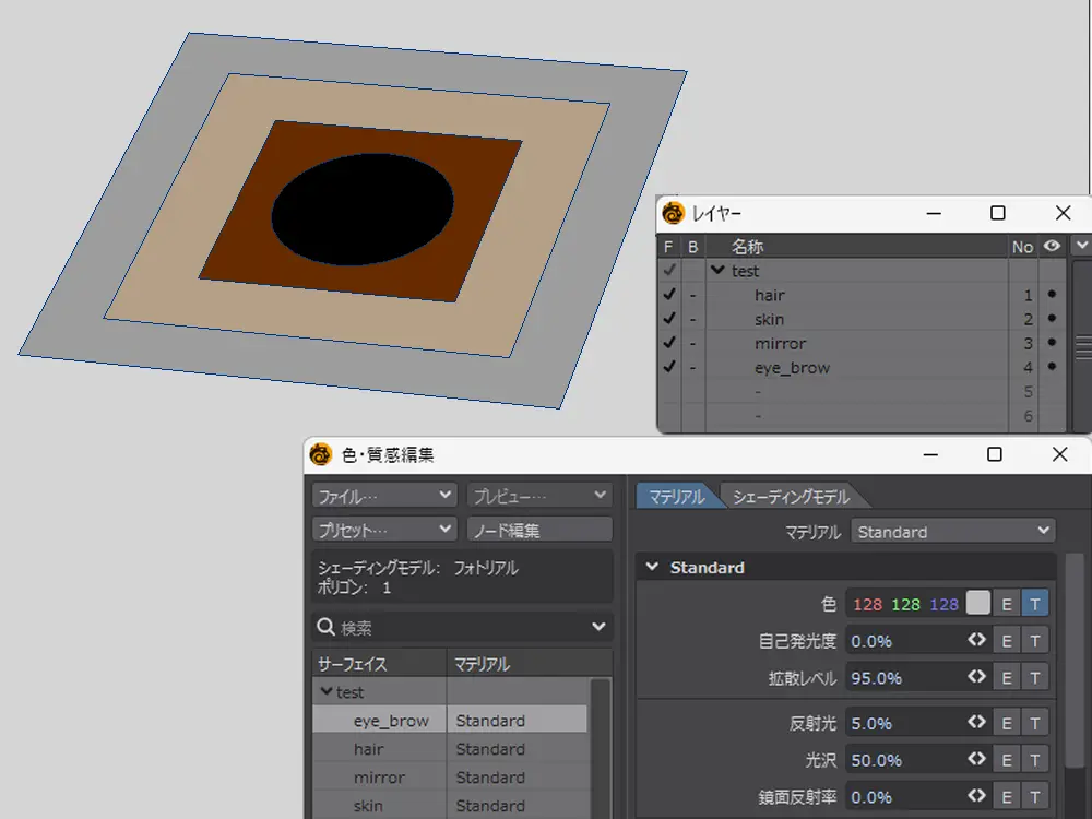 レイアウトに持ち込んだら、ミラー→髪→まゆげ→肌の順になるように置きます