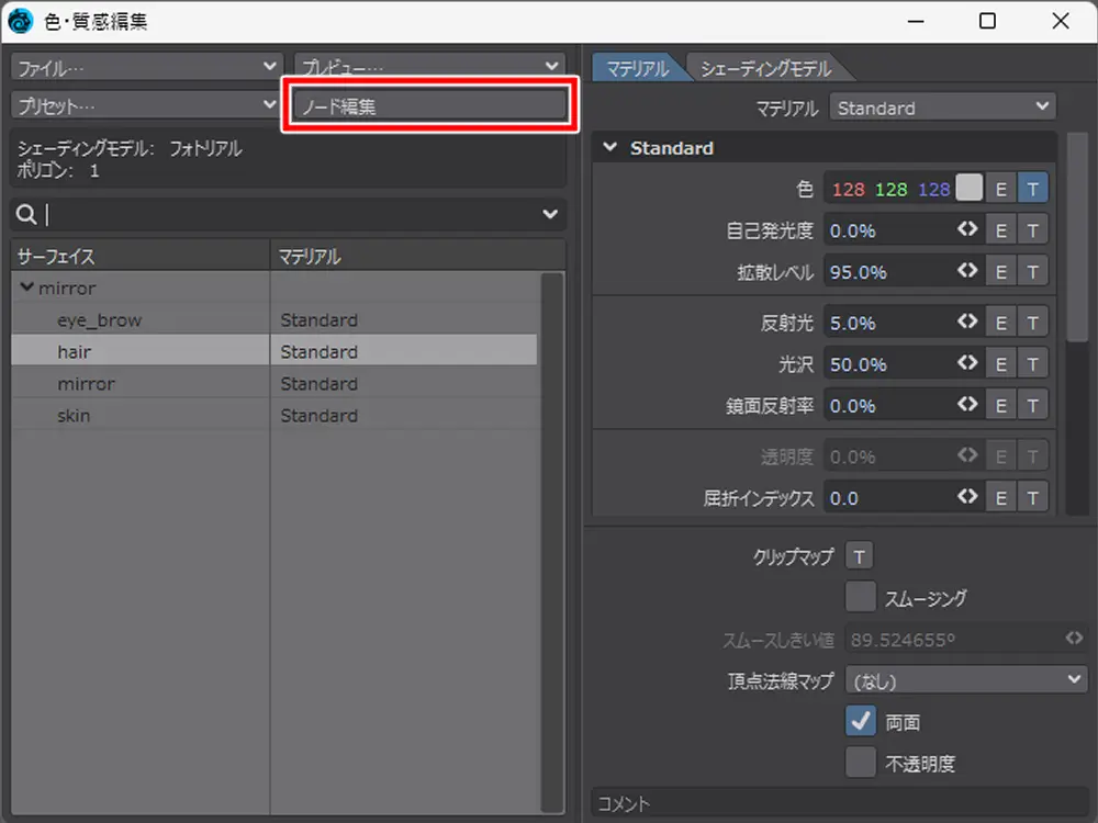 色・質感編集から「ノード編集」をクリック