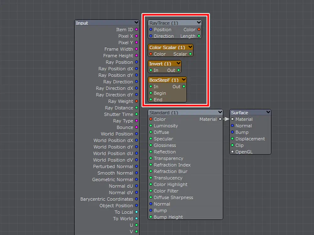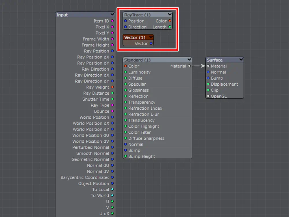 - RayTrace ノードは光や色情報を受取る