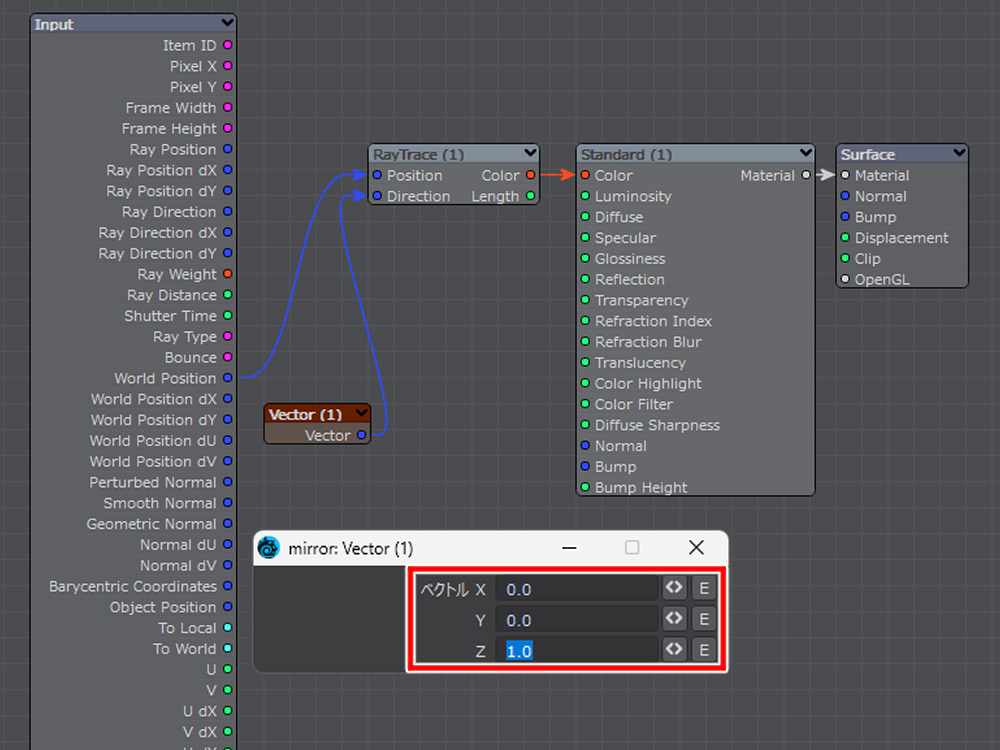 Vector ノードを使っているのは Input にある Ray Direction に繋いでも、何も起こらなかったので使っています