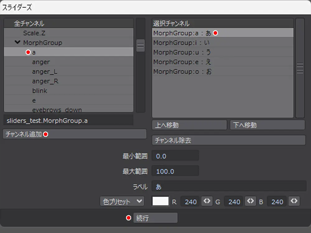 スライダーズに表示したいモーフを選択して、「チャンネル追加」で追加していきます