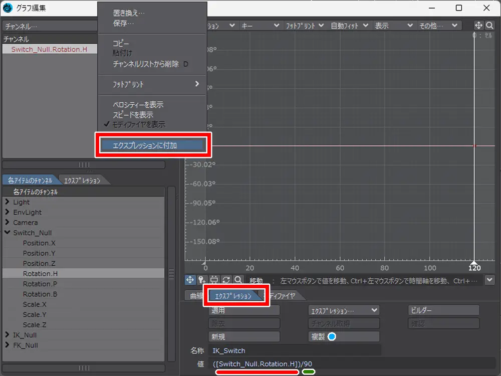 エクスプレッションタブで、名前が IK_Switch になっていることを確認して適用