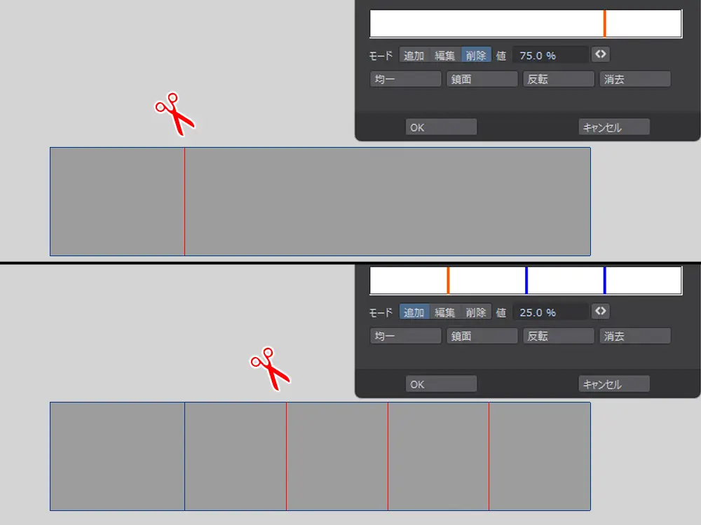 さらにカットを追加して、指とのポイント数と同じになるようにします