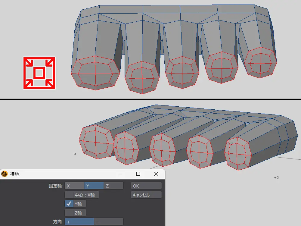 縮小すると先端部分が少し地面から浮いちゃうので、「接地」ツールを起動して底面に接地します