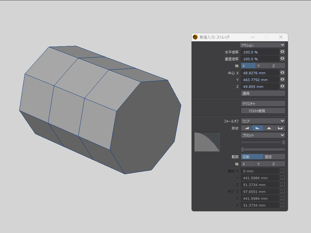過去記事ではエッジ単位でちょっとずつ変形していましたが、「ストレッチ」のフォールオフ機能を使えばもっと簡単にできることが分かりました