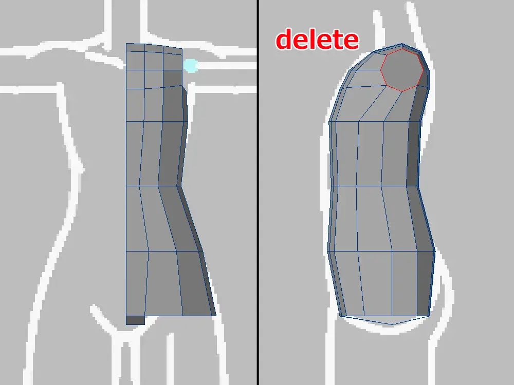 はじめに八角形の円柱を体の左腕側に置いて、カットを入れながら胴体の形を簡単に作っていきます