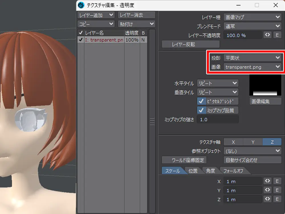 もう一度、前髪の透明度のテクスチャ編集をオープン
