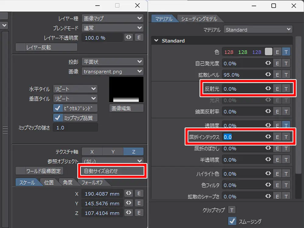そして、色・質感編集の「反射光」と「屈折インデックス」を 0.0 に変更