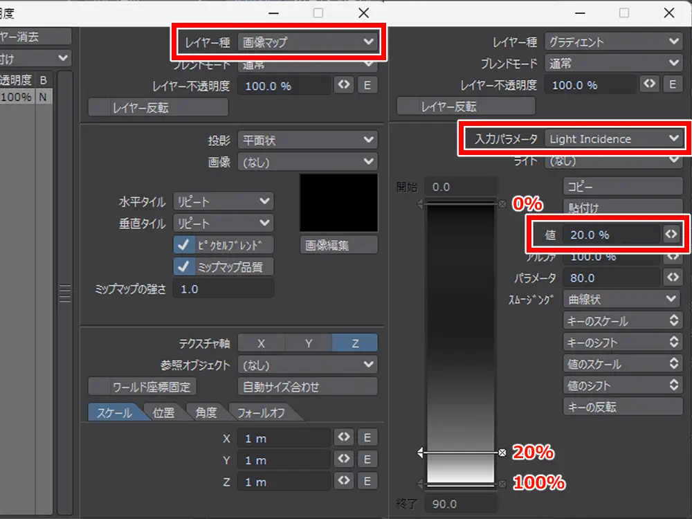 前髪の透明度のレイヤー種を「画像マップ」から「グラディエント」に変えています