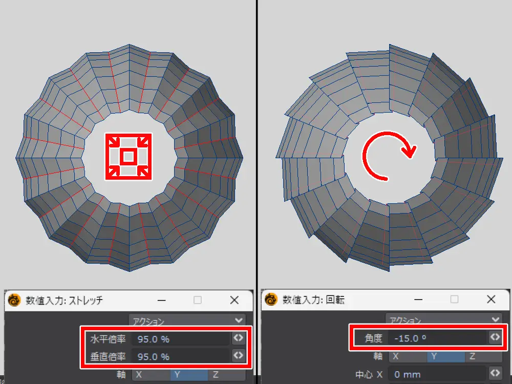 あとは緑丸の 3 か所のピッチ回転角度を変えていきます