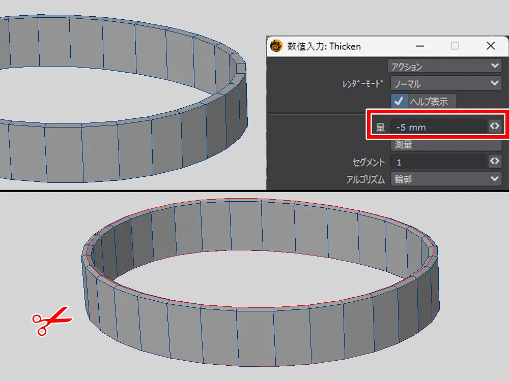 このカットをいれておかないと細分化した時に、ただの球状になってしまうので入れています