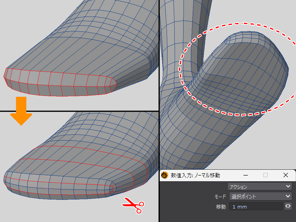 ノーマル移動(法線移動)で 1mm 程大きくしますが、素体と靴下を同時に表示して貫通していなかったら OK