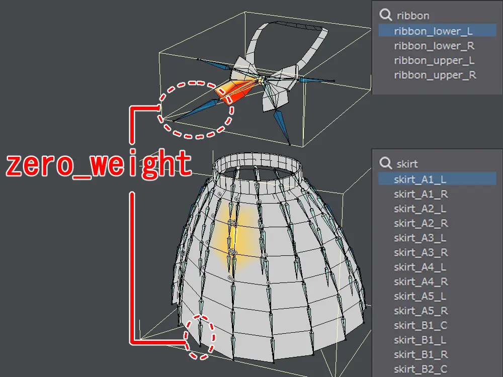 リボンとスカートのボーンを移動する