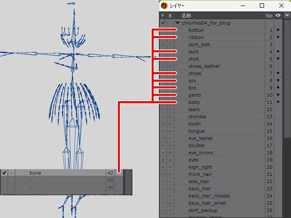 リボンとスカートに入っているボーンを、ボーンレイヤーへ切り取って移動します