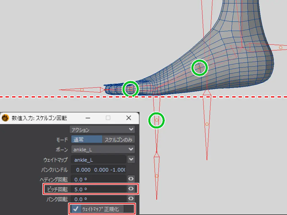 ウェイト付けが終わったら、モデラーに戻って埋まっているかかとを上げていきます
