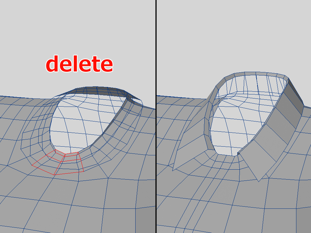 すると、不要なエッジが3本できますが、これは削除しちゃいます